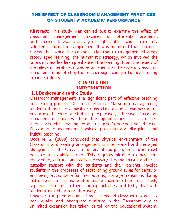Apart from this, students no longer have confidence in writing exams on their own without examination Dishonesty (Mgbikem 2004). However, this research tends to take a look into how Classroom management techniques has affected the academic performance of students in economics from secondary schools
